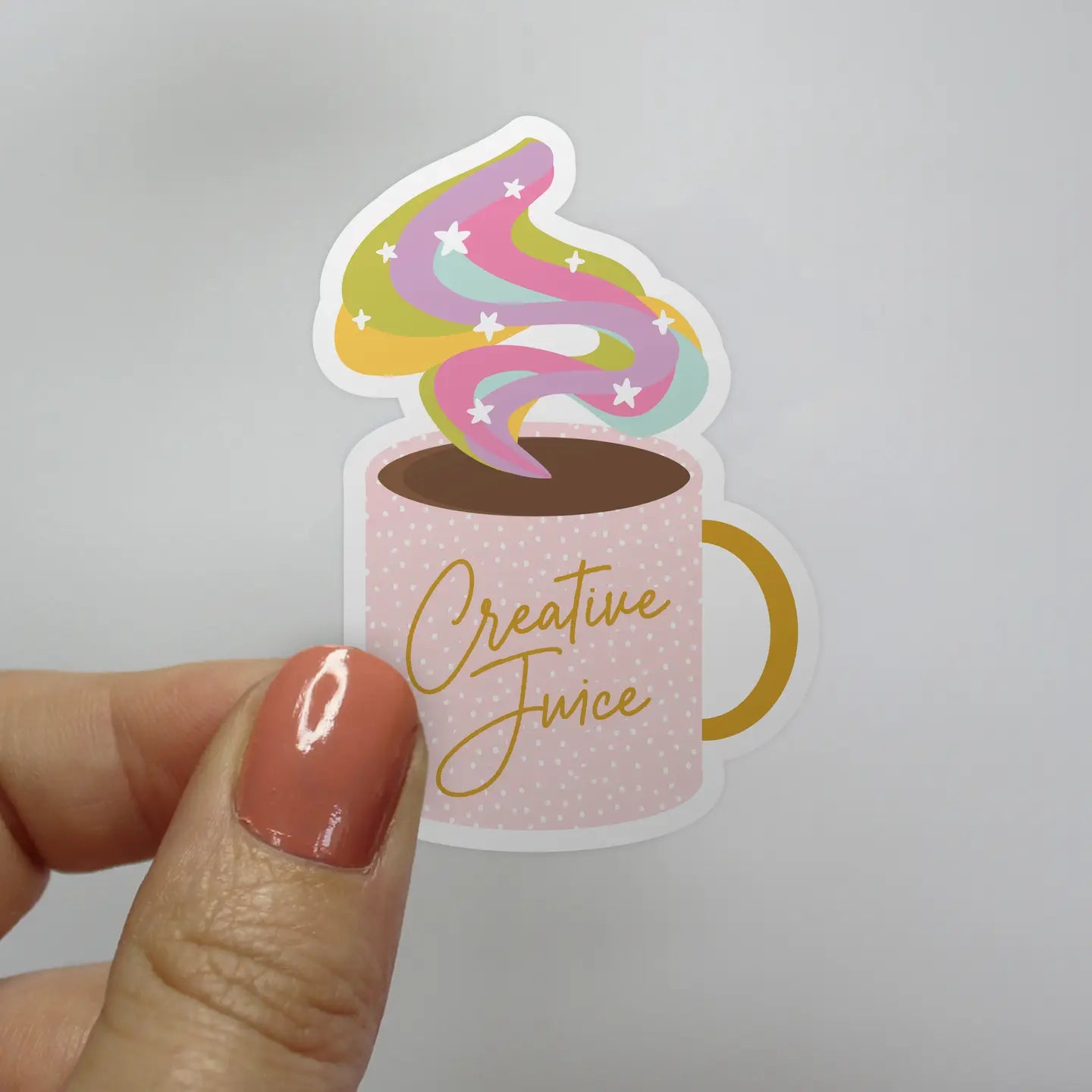 This fun sticker is perfect for your laptop, notebook & more! The pink and white polka dot coffee mug contains text that reads "Creative Juice" with rainbow swirls and stars. This sticker is sized to 3 x 2 inches with a glossy, water-resistant coating.