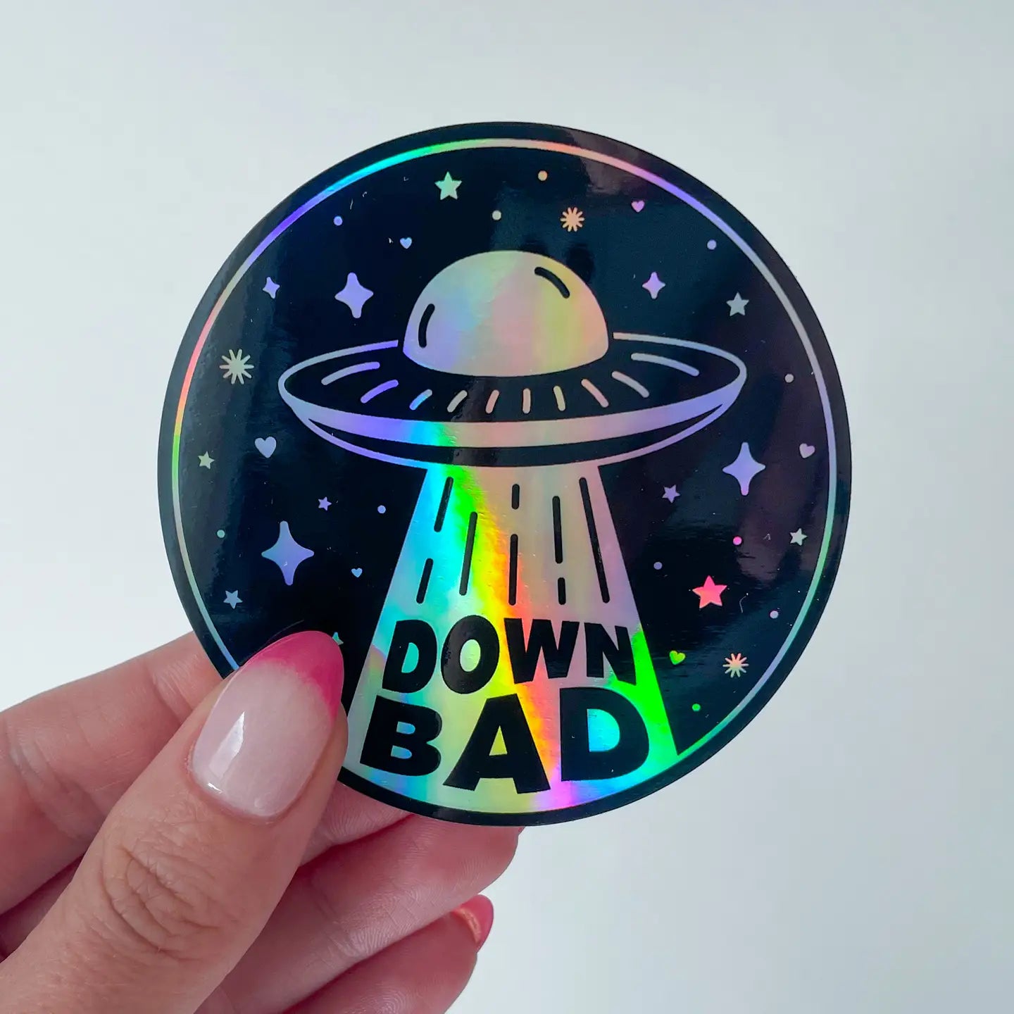 This fun sticker is perfect for your laptop, water bottle, notebook & more! This sticker has text reading "Down Bad" from Taylor Swift's song with stars and a spaceship graphic on a black background. This sticker is sized to 3 x 3 inches with a vibrant rainbow holographic shine and is waterproof, scratchproof, and weatherproof.