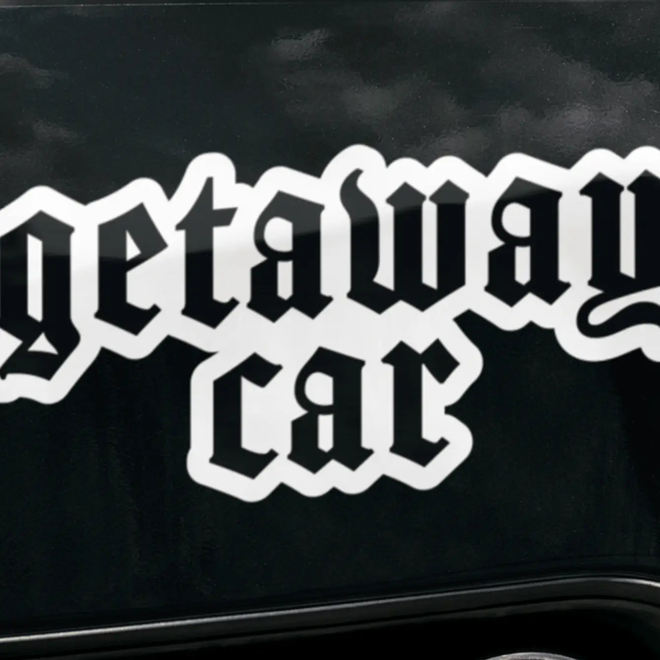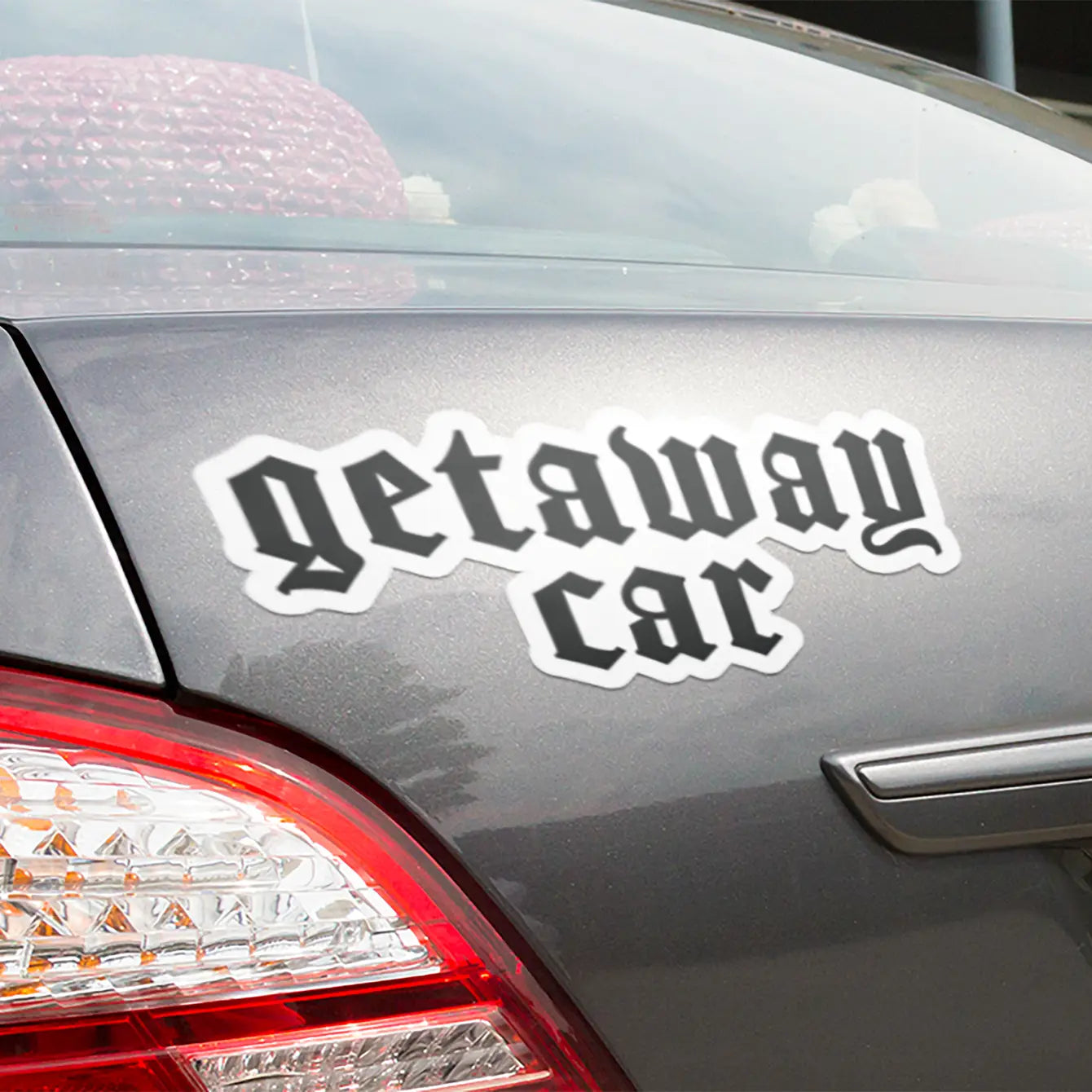 Customize your mirror, window, wall & more! The black text reads “getaway car” in gothic lettering from Taylor Swift's song. This sticker is sized to 7.5" wide x 3.4" tall and is printed on thick, durable vinyl with removable adhesive.