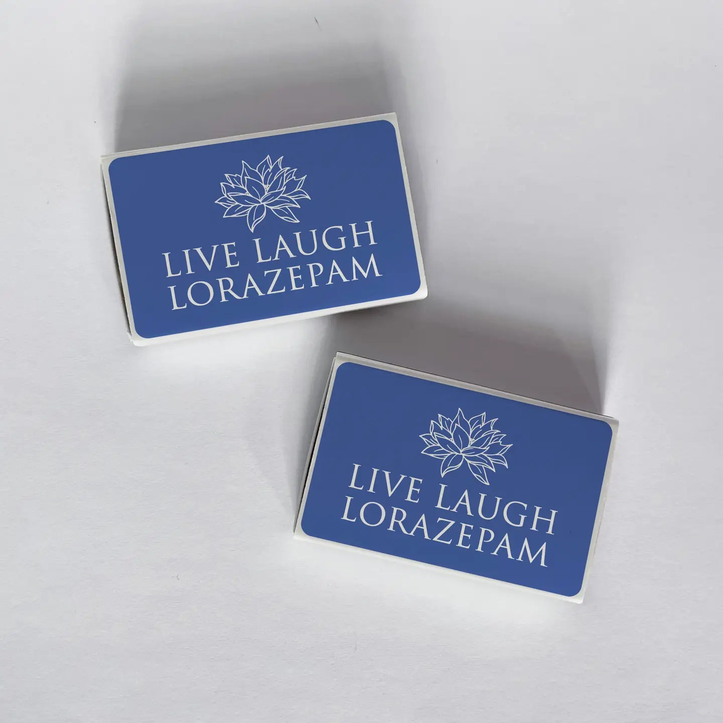 Light up any moment with these handmade matchbooks, designed to spark conversation as much as candles. Perfect for gifting, event favors, or simply elevating your everyday coffee table aesthetic. This matchbook has a blue background and features a white lotus flower graphic with classic serif text reading "Live Laugh Lorazepam". The box is sized to 2.25"L x 1.38"W x .38"H. Each box is made of cardboard and contains 18 white-tipped wooden matches with a match starter on one side.
