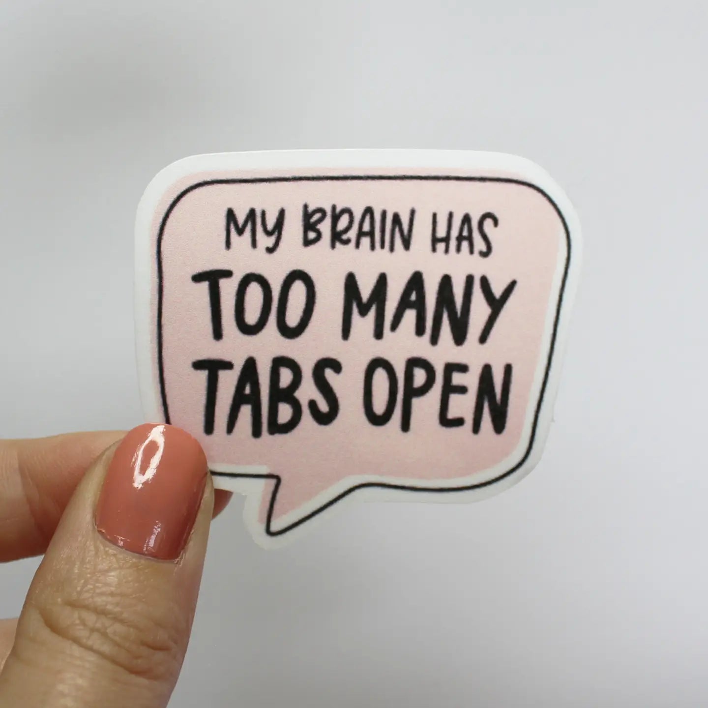 This fun sticker is perfect for your water bottle, notebook & more! The graphic is a pink hand drawn speech bubble reading "My brain has too many tabs open" in black text. This sticker is sized to 2.75 x 2.5 inches with a glossy, water-resistant coating.